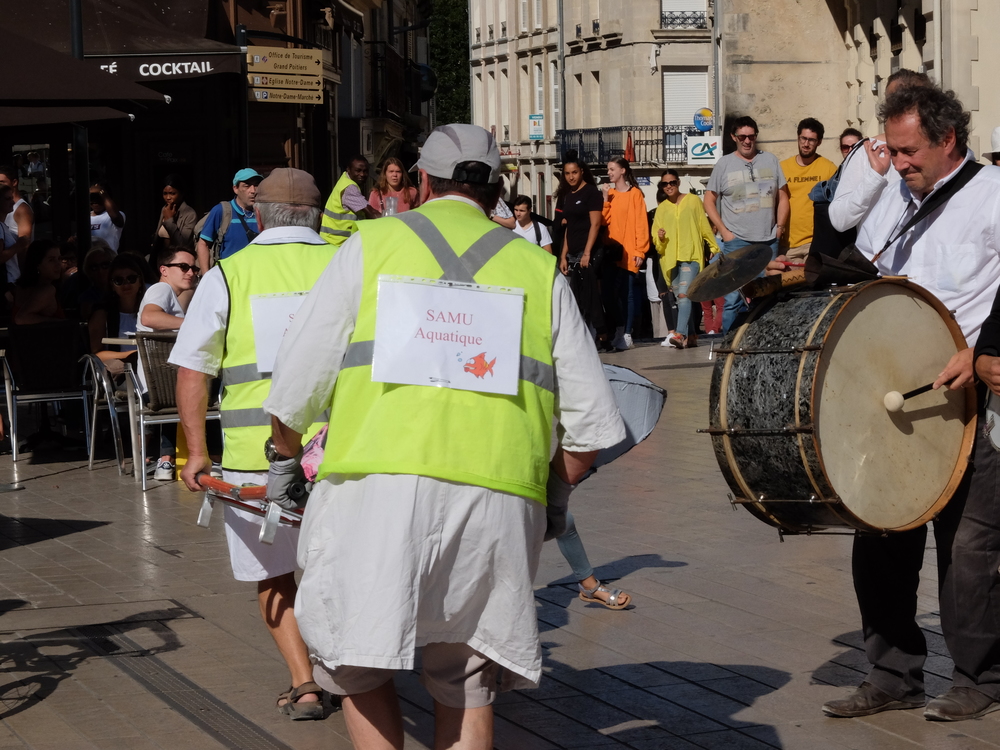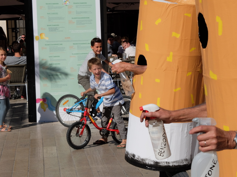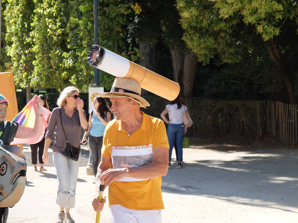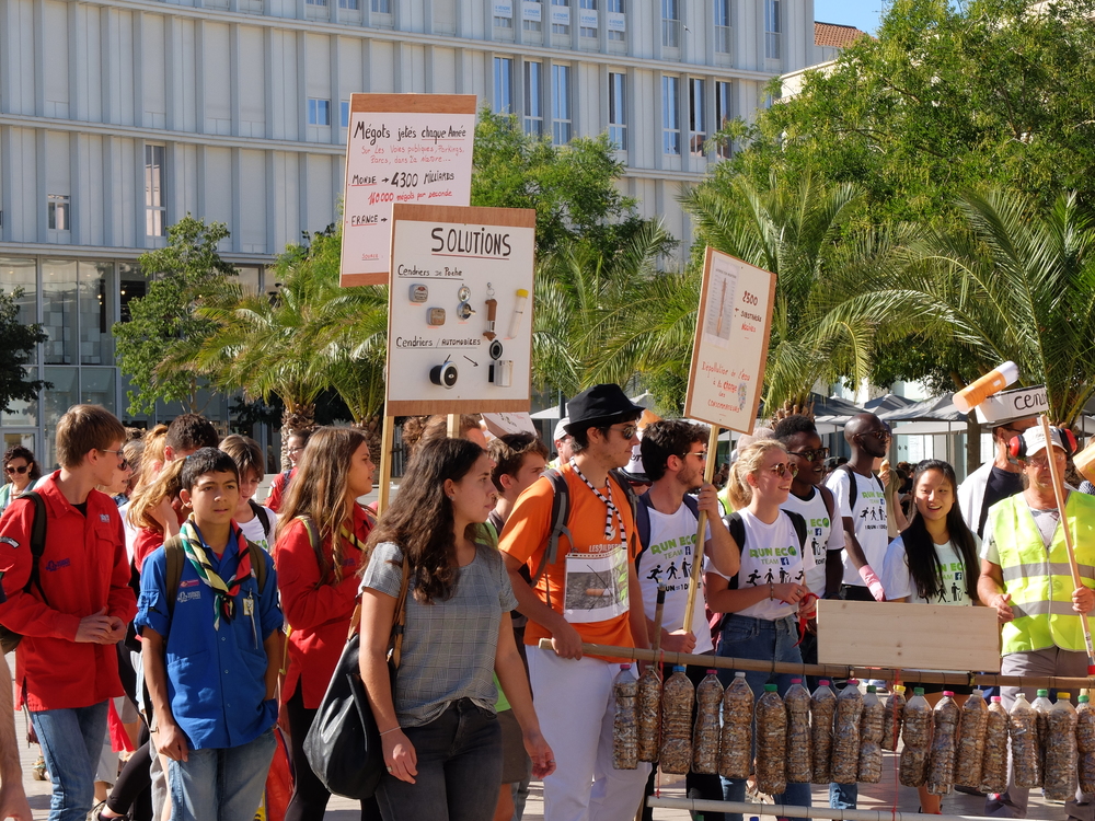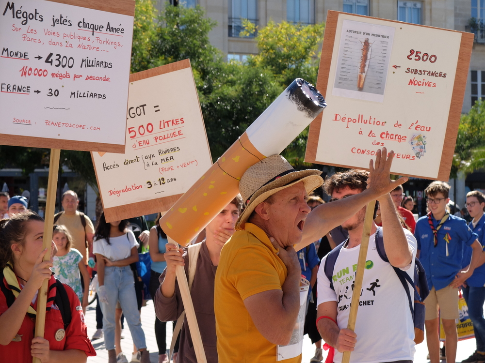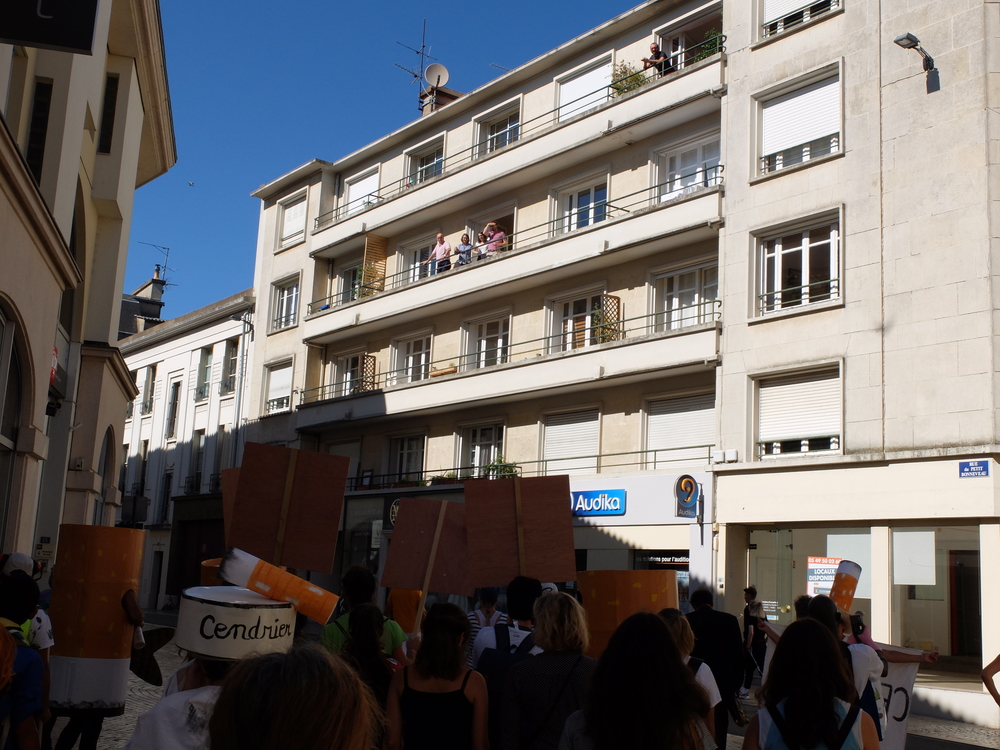 Une collecte de déchets (à Poitiers c’était les mégots) était organisée sous la forme d’une déambulation festive et pédagogique pour informer le grand public de la nocivité des produits contenus dans les mégots de cigarette (métaux lourds, arsenic, mercure, …); Un mégot représente 500 litres d’eau polluée avec une durée de vie comprise entre 3 et 12 ans (3éme cause de pollution des estuaires).