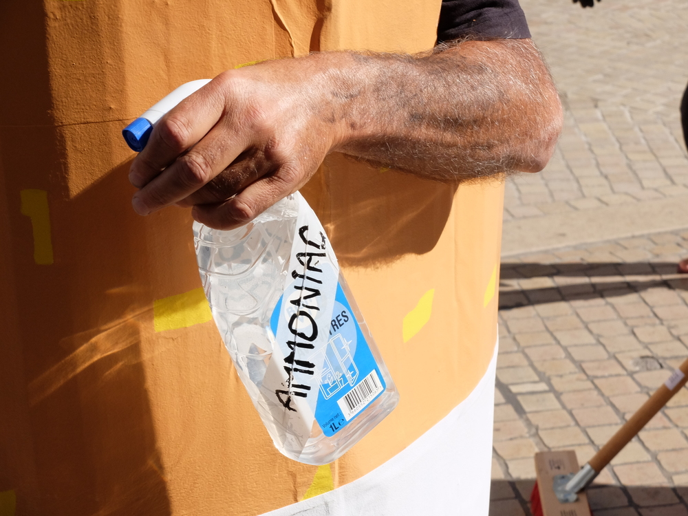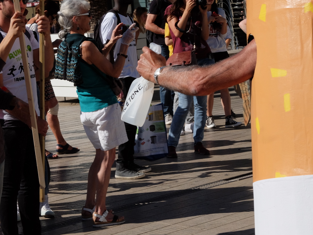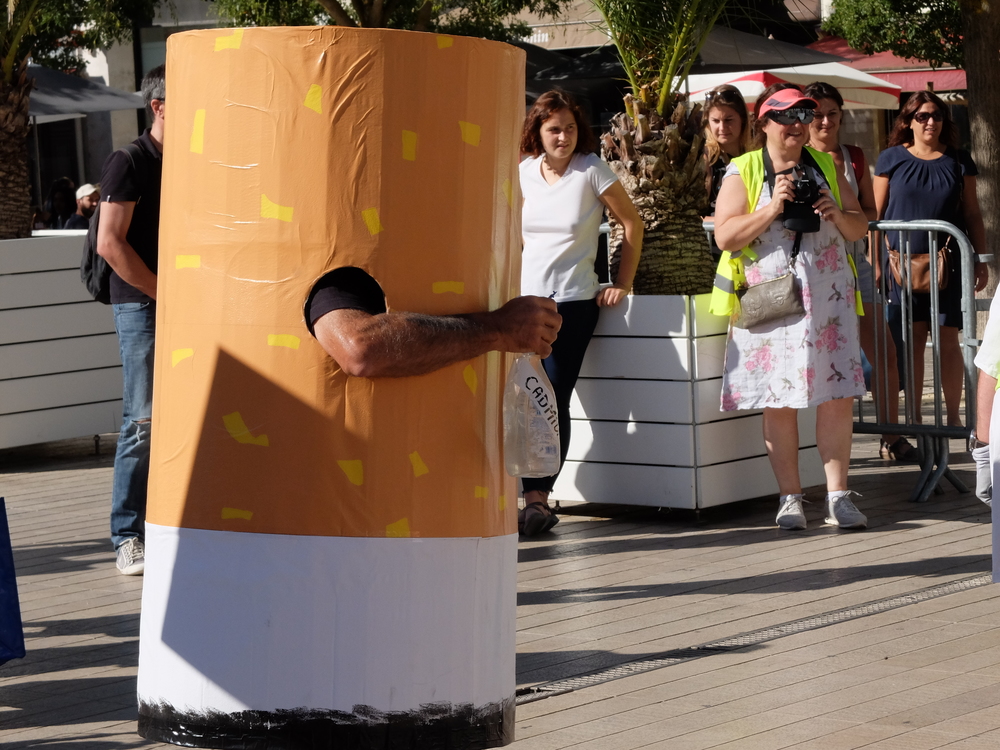 Les mégots géants arrosaient le public d’une eau rappelant les produits toxiques contenus dans les vrais mégots