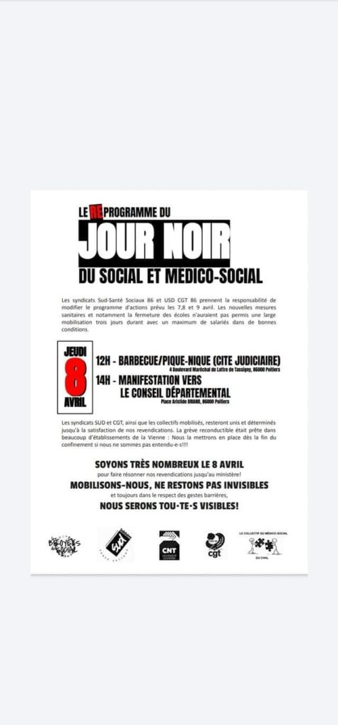 Les syndicats Sud-Santé Sociaux 86 et USD CGT 86 prennent la responsabilités de modifier le programme d’action prévu les 7,8 et 9 avril. Les nouvelles mesures sanitaires et notamment la fermeture des écoles n’auraient pas permis une large mobilisation trois jours durant avec un maximum de salariés dans de bonnes conditions.