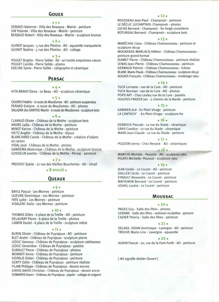 Pendant 3 jours, un « Circuit d’Artistes » est proposé dans le sud-Vienne entre Gouex, Persac, Queaux et Moussac. Ils n’attendent plus que votre visite…