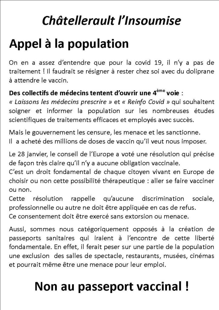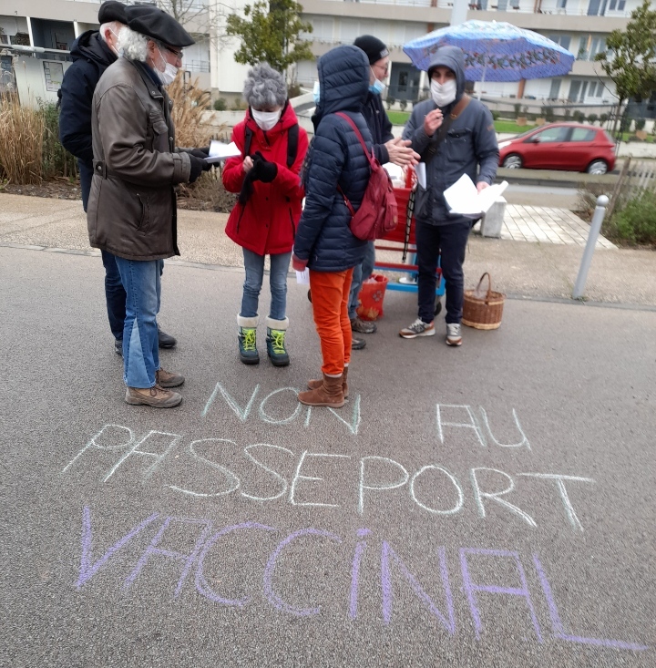 Nous étions huit de Châtellerault l’Insoumise sur le marché de la Plaine d’Ozon ce matin avec notre stand à roulettes (inattaquable !) à offrir du café, des petits gâteaux, à discuter avec les gens (oh que ça fait du bien de discuter !!) et à dire notre refus du passeport vaccinal.