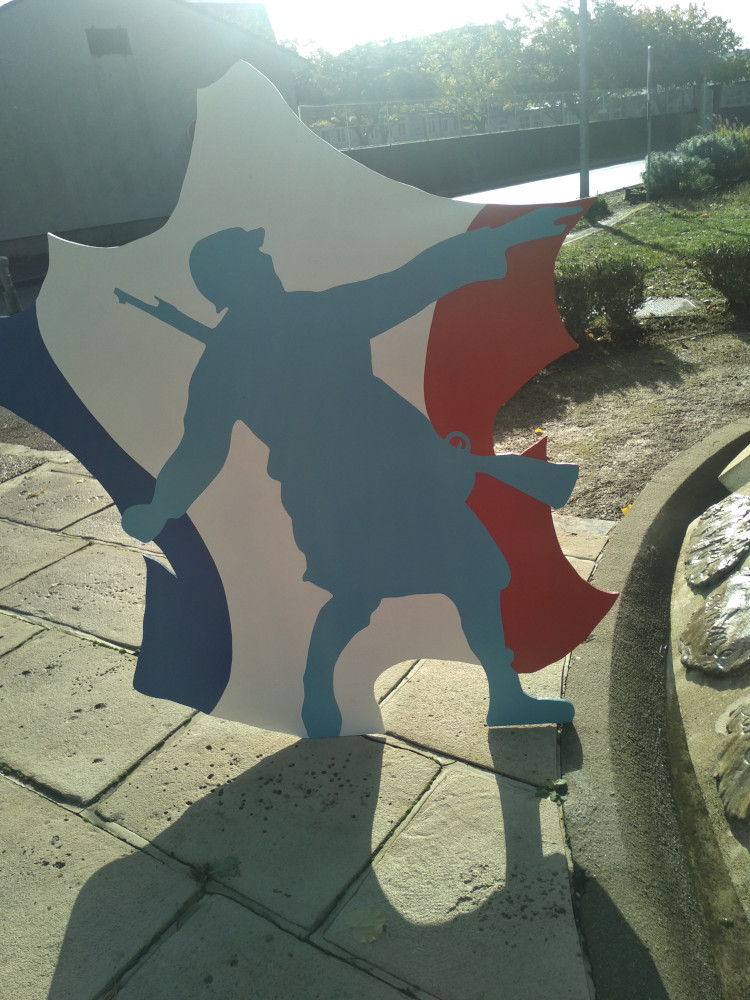 Et que voit-on depuis quelques jours devant ce monument ? 2 pancartes en bois représentant chacune une carte de France, peinte en bleu-blanc-rouge, et traversée de la silhouette d’un soldat en action !!