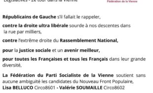 Le Parti Socialiste de la Vienne soutient L. Belluco et V. Soumaille, circo 1 et 2