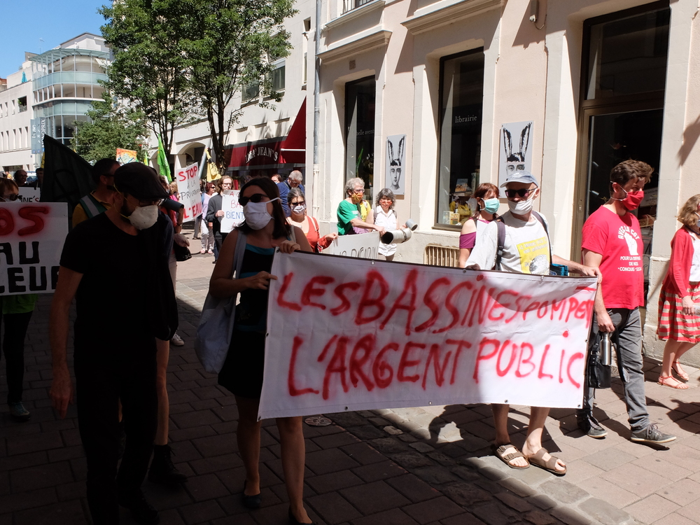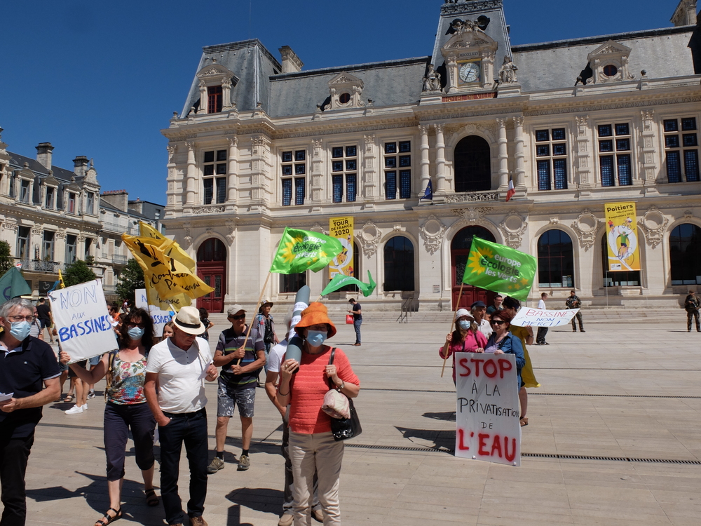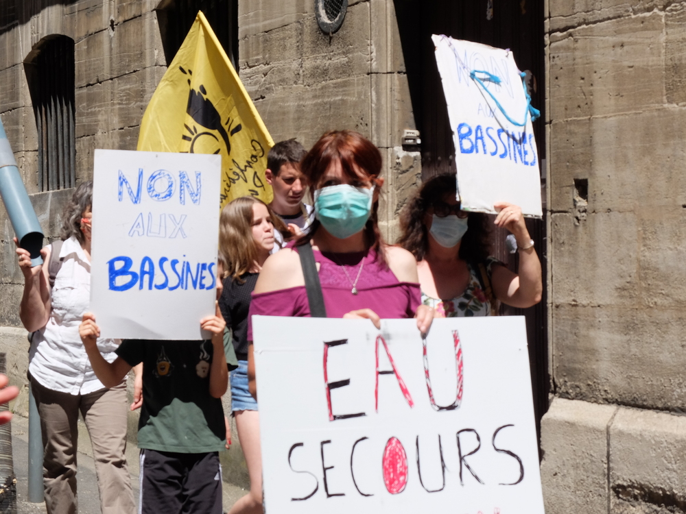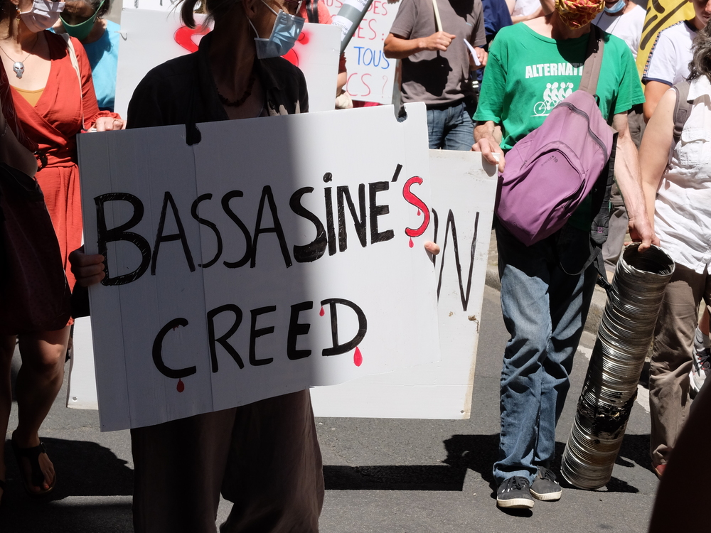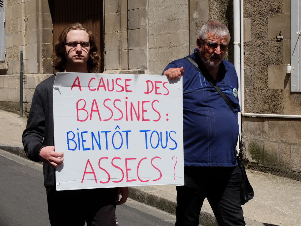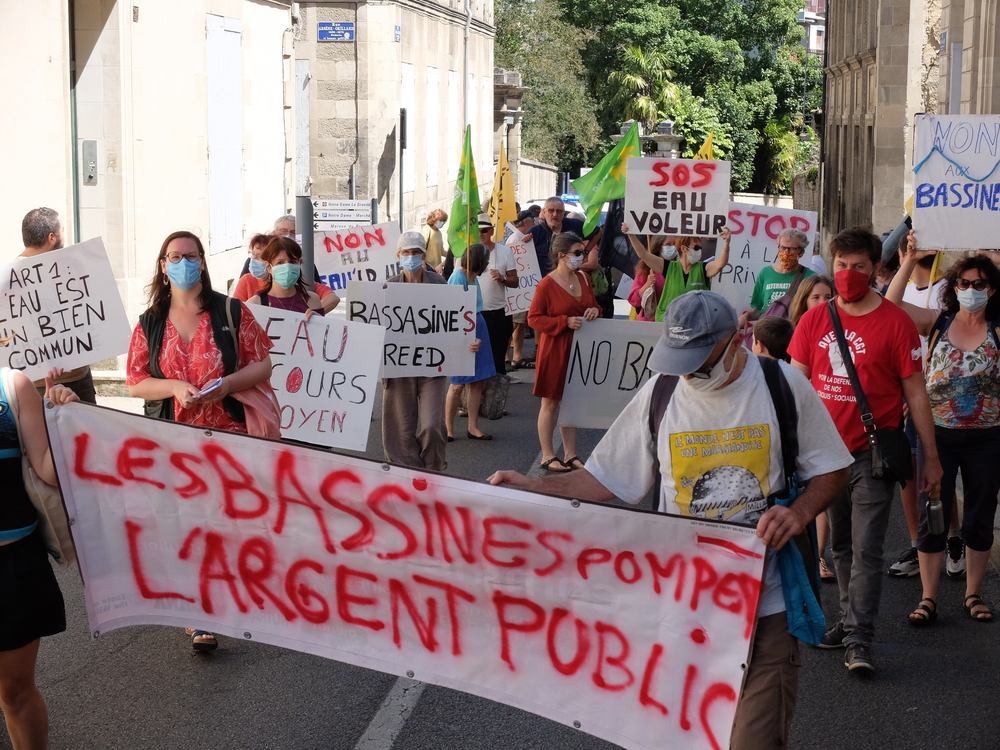 Les « bassines » ce sont ces gigantesques réservoirs d’eau qu’une minorité de gros agriculteurs pompent dans les nappes souterraines (rien à voir avec un récupérateur d’eau de pluie !) en hiver pour arroser leurs cultures d’exportations le reste de l’année. Ils pompent ainsi la même ressource en eau que celle qui sert à l’eau potable (qu’ils polluent d’ailleurs avec nitrates et pesticides) et le font avec l’argent public de nos factures d’eau pour 70% et avec l’argent de l’Union Européenne que gère la Région (plus de précisions ici ou bien là )
