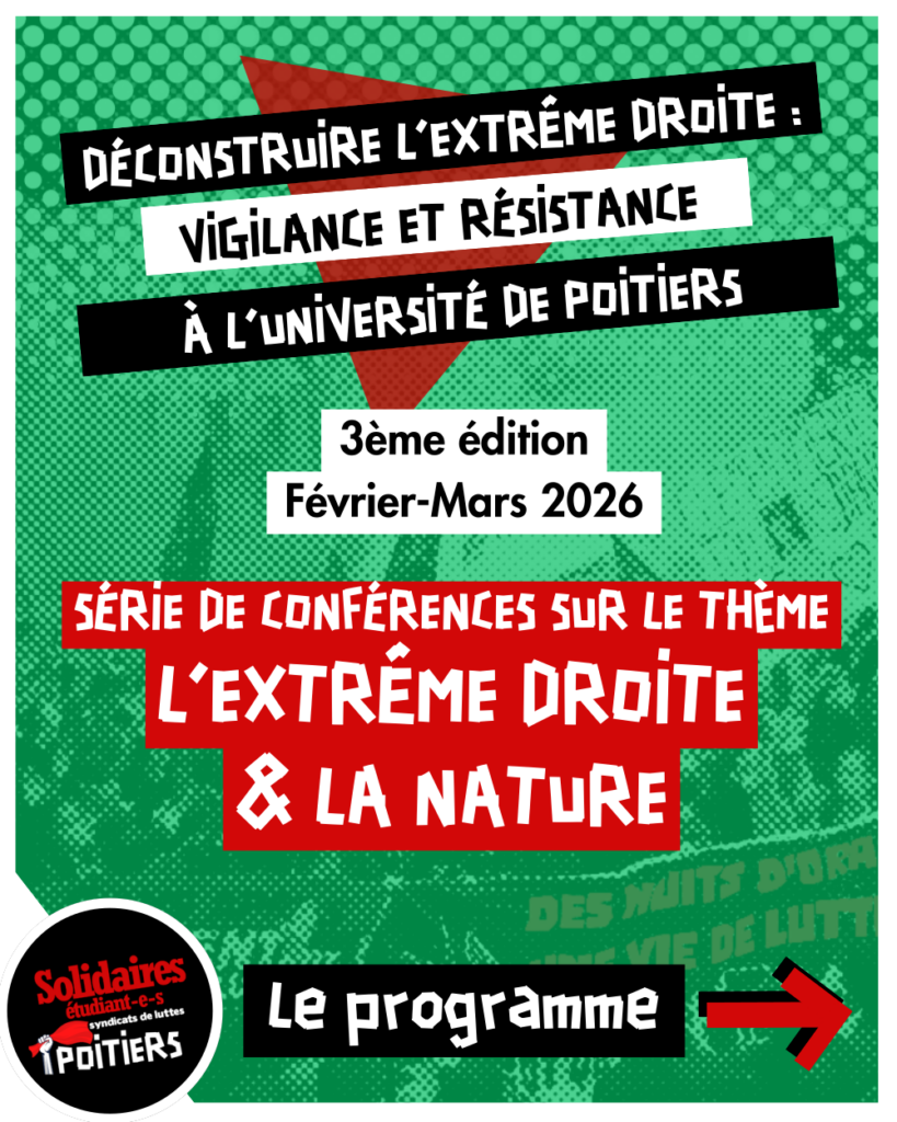 « Déconstruire l’extrême-droite. Vigilance et résistance à l’université de Poitiers« . 3ème édition, février-mars 2026. Une série de conférence sur l’extrême-droite et la nature ». Gratuit et ouvert à tou-tes.