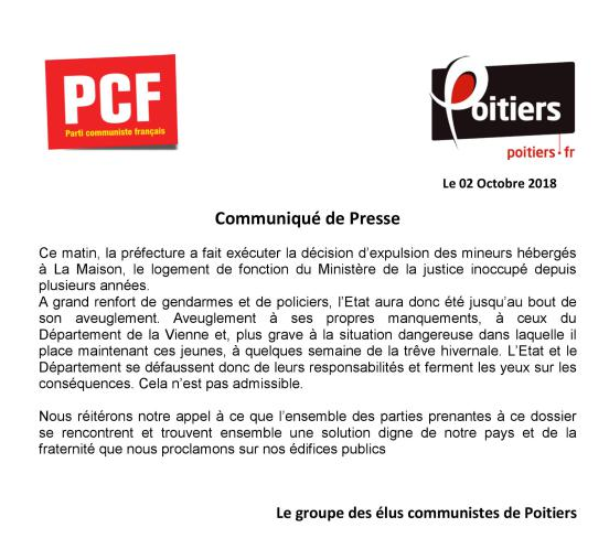 Voilà, ils l’auront fait ! Malgré la magnifique démonstration citoyenne du collectif la Maison qui a montré une voie possible pour les jeunes mineurs isolés étrangers sans solution en faisant vivre un projet d’hébergement digne et responsable, un projet d’accompagnement éducatif et humain et en interpellant les responsables politiques pour les convaincre de sortir de leur zone de confort. Malgré l’énorme mobilisation des poitevins qui se sont relayés, matin après matin, pour protéger la maison, qui se sont retrouvés par centaines pour dire leur soutien mercredi dernier, puis lundi au moment du conseil municipal, malgré les appels des formations politiques qui se réclament de la gauche quasi unanimes. Ils ont préféré fermer les portes, remettre à la rue, s’abriter derrière une décision de justice pour ne pas vraiment voir. Aujourd’hui, avec les dix mineurs sommés de reprendre leur errance, c’est notre solidarité qui se retrouve sur le trottoir, désemparée. Quelles réponses sérieuses et concrètes ceux qui n’ont pas voulu entendre vont-ils proposer maintenant ? Quelle autre solution, en attendant une hypothétique réponse, que de rouvrir un squat précaire et sans projet ? Préfecture, conseil départemental, mairie doivent travailler à une solution concrète dès aujourd’hui.
