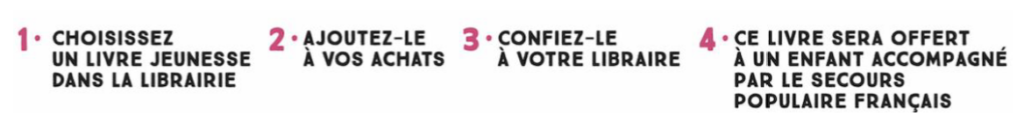 Du 17 octobre (Journée mondiale du refus de la misère) au 20 novembre 2023 (Journée internationale des droits de l’enfant), les librairies indépendantes se mobilisent et organisent une opération solidaire intitulée Donnez à lire. Sur le même principe que celui d’un café suspendu, elle permet aux clients des librairies d’offrir des livres jeunesse aux enfants et adolescents dont les familles sont accompagnées toute l’année par le Secours populaire français.