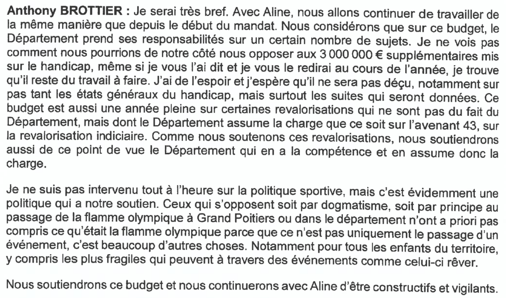 Ci-dessous, un extrait de l’intervention d’A. Brottier sur le vote du budget primitif 2022, (à retrouver sur https://www.lavienne86.fr/le-departement/administration/espace-reglementaire/les-proces-verbaux , : descendre jusqu’à « séance de clôture du 16 décembre 2022 » dossier à déziper, c’est page 146 du tome 6) . En 2023, comme en 2024 et en 2025, il a aussi voté pour le budget de la droite départementale.
