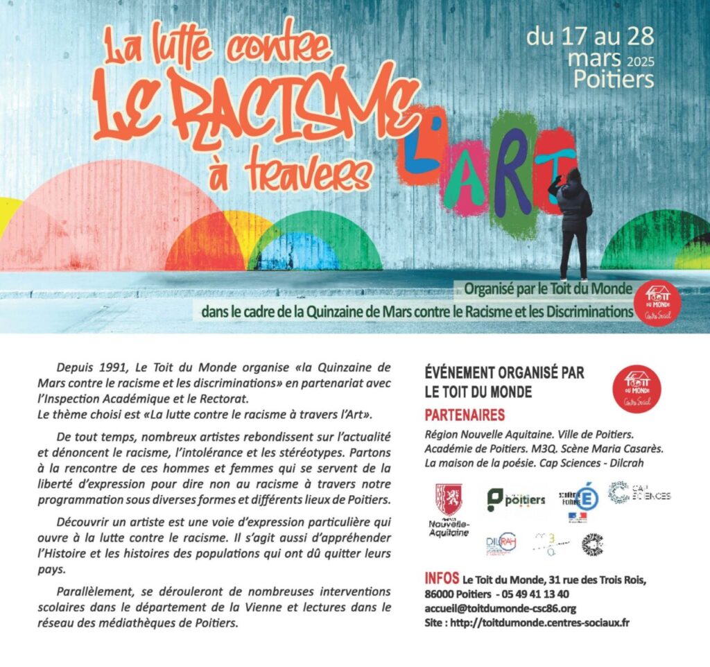 Le thème choisi cette année est « La lutte contre le racisme à travers l’Art ». De tout temps, nombreux artistes rebondissent sur l’actualité et dénoncent le racisme, l’intolérance et les stéréotypes. Partons à la rencontre de ces hommes et femmes qui se servent de la liberté d’expression pour dire non au racisme à travers notre programmation sous diverses formes et différents lieux de Poitiers.