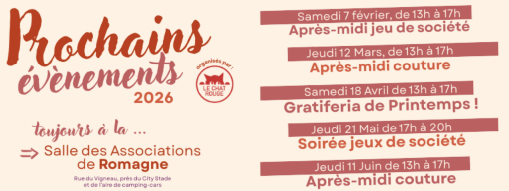 « Le Chat Rouge est une association qui fait bouger Romagne avec des événements solidaires et culturels. On y cultive le partage, l’écologie, la décroissance joyeuse, le jeu et le local, dans un esprit inclusif, bienveillant et loin des logiques marchandes.