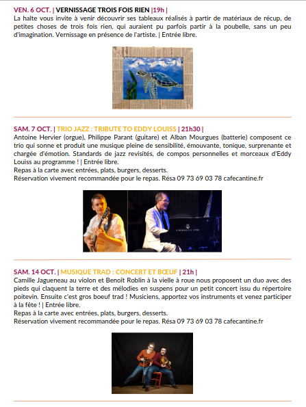 Oublié septembre, voici venir octobre… Et au Café-Cantine de Gençay, ça turbine dur : de la musique, des expos et on y mange (bien) aussi : le programme sur octobre et novembre : http://cafecantine.fr/concerts/