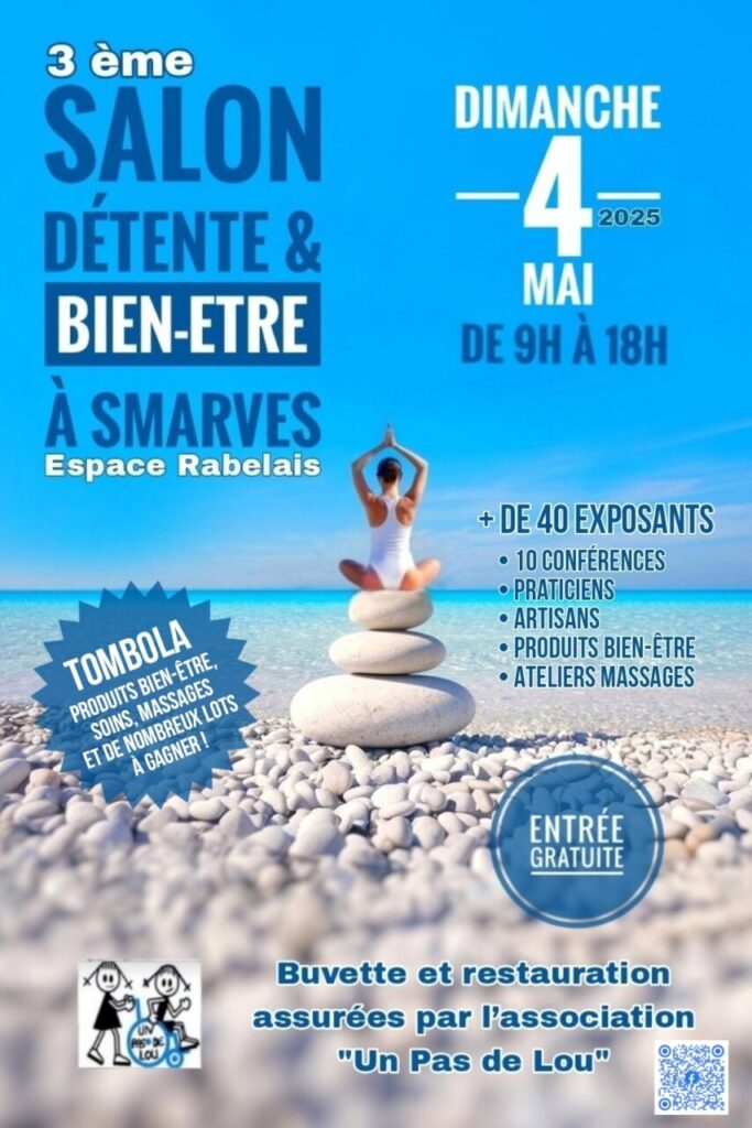La troisième édition du salon détente & bien-être à Smarves est programmé le dimanche 4 mai 2025 ! L’association « Un Pas de Lou » se joint à nous pour faire de cette journée un doux moment en tenant la buvette avec un coin repas pour se restaurer tout au long de la journée.