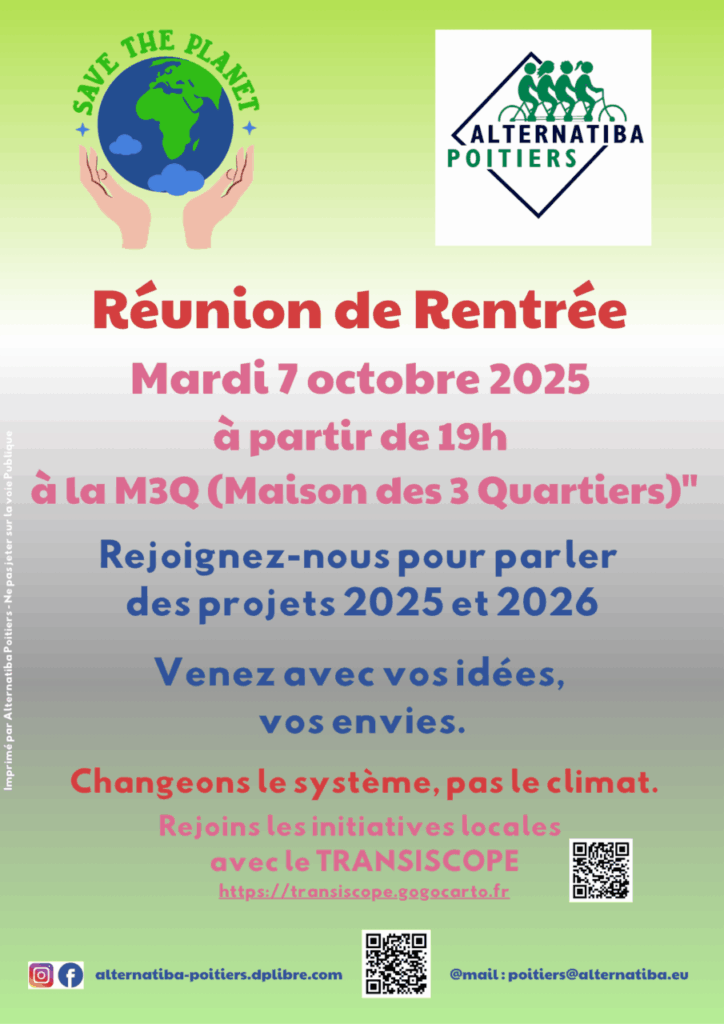 L’association Alternatiba Poitiers vous convie à sa réunion de rentrée qui aura lieu le mardi 7 octobre 2025 à partir de 19h à la M3Q (Maison des 3 Quartiers située au 25 rue du Général Sarrail à Poitiers). Vous trouverez l’affiche en pièce jointe.