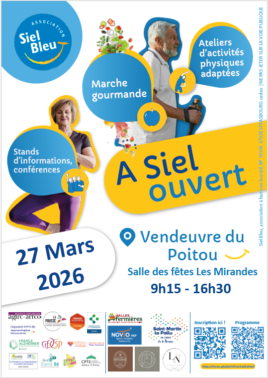 L’association Siel Bleu 86 organise une grande journée « A Siel Ouvert », le vendredi 27 Mars 2026, sur la commune de Vendeuvre du Poitou, à la salle des Mirandes. L’objectif de cette journée est de faire connaître l’ensemble des actions que mènent et proposent l’association Siel Bleu et animer une journée conviviale, active et dynamique à l’ensemble des personnes participantes, marquée par des temps d’Activités Physiques Adaptées.