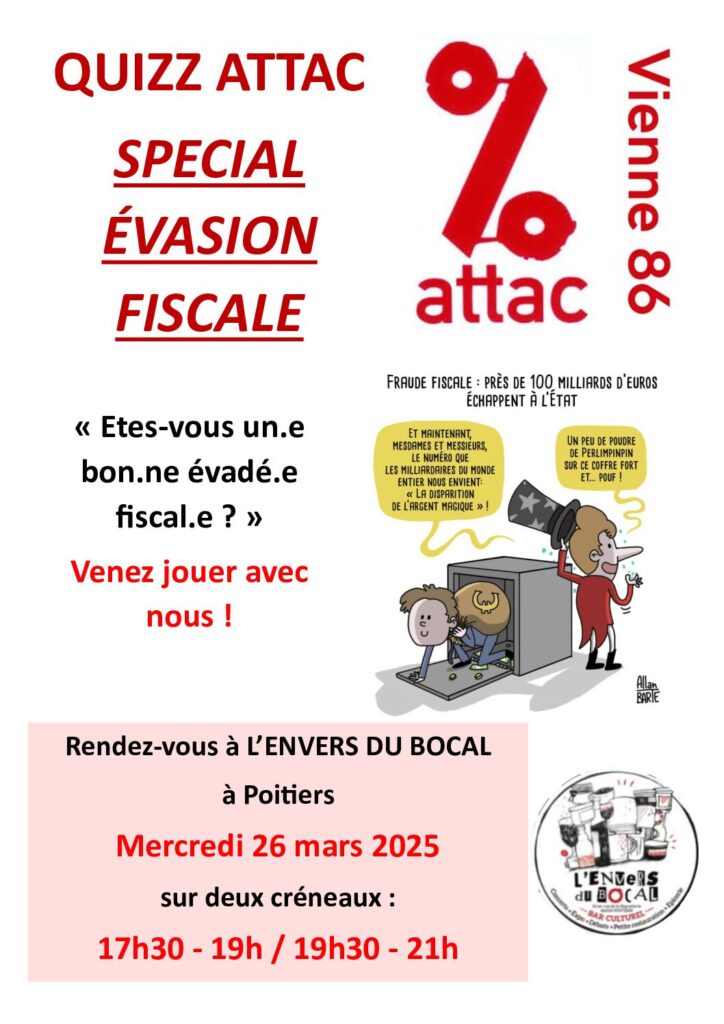 A partir des quizz réalisés par nos collègues d’autres comités locaux d’ATTAC, nous vous proposerons de parfaire vos connaissances sur l’évasion fiscale, sur comment la combattre et mettre en place une véritable justice fiscale.