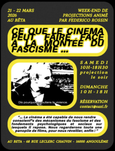 Federico Rossin, propose au Bêta, le 21 et 22 mars 2026 la diffusion de plusieurs films et des discussions et présentations autours de ceux-ci.