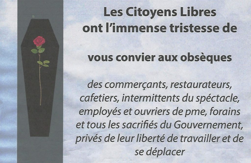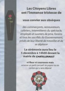 Samedi 5 décembre à 14h00 Place de la mairie à Châtellerault, un Rassemblement puis déambulation sur le Thème « NOS OBSEQUES » est déclaré en préfecture, s’y rendre est donc légal, en remplissant une attestation spécifique ou en ajoutant un motif sur une attestation papier et avec du bon sens.