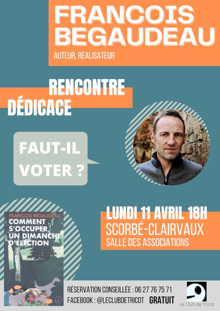 Événement ! François Bégaudeau vient présenter son dernier essai Comment s’occuper un dimanche d’élection à Scorbé-Clairvaux. Moment convivial d’échange et de dédicaces, avec vente de livres sur place.