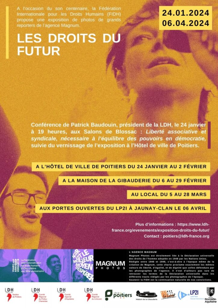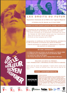 Cette conférence sera suivie à 20h30, à l’Hôtel de Ville, du vernissage de l’exposition « Les Droits du Futur » créée par la FIDH, (Fédération Internationale pour les Droits Humains), à l’occasion de son centenaire, avec des photographies de l’Agence Magnum.