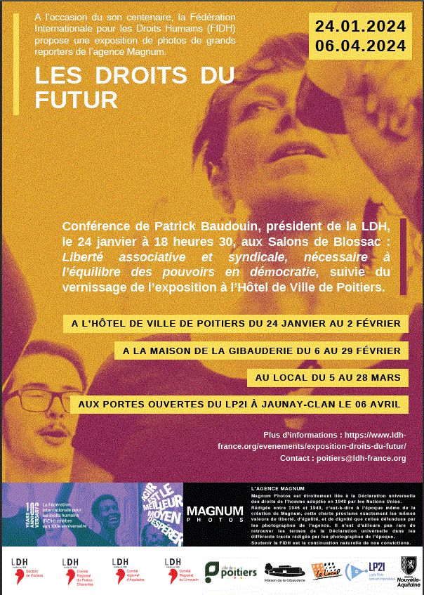 Mercredi 24 janvier 19h avec Patrick Baudouin, Président de la LDH, conférence-débat intitulée « Liberté associative et syndicale, nécessaire à l’équilibre des pouvoirs en démocratie », Salons Blossac Poitiers. Cette conférence sera suivie à 20h30, à l’Hôtel de Ville, du vernissage de l’exposition « Les Droits du Futur » créée par la FIDH, Fédération I.nternationale pour les Droits Humains, à l’occasion de son centenaire, avec des photographies de l’Agence Magnum. Vous pourrez la voir à Poitiers du 24 janvier au 11 avril.