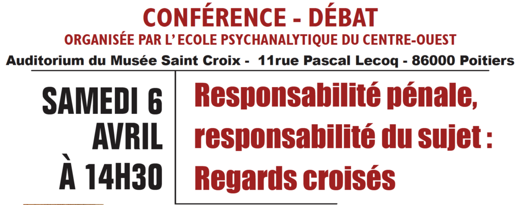 L’ Ecole Psychanalytique du Centre-Ouest organise samedi 6 avril une conférence à Poitiers qui pourrait intéresser des juristes, des psychologues, des psychanalystes, des travailleurs sociaux, et au delà un public élargi.