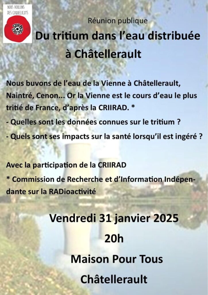 L’association Nous Voulons des Coquelicots – Grand Chatellerault organise cette réunion d’information par des spécialistes indépendants de la CRIIRAD pour nous expliquer l’origine du tritium et les recherches en cours afin d’en estimer les risques.