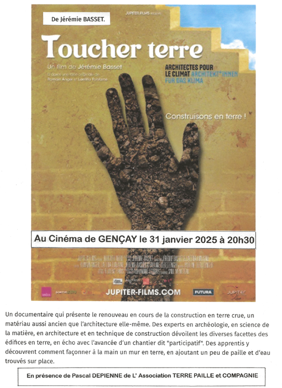 Au cinéma de Gençay, projection du documentaire « TOUCHER TERRE » en présence de Pascal Depienne de l’association « Terre paille et compagnie ».