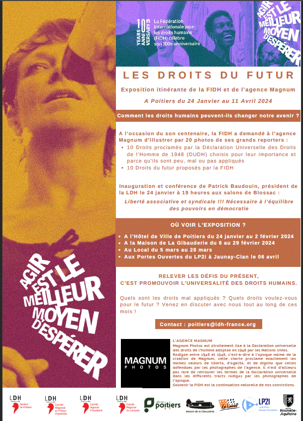 Exposition « Les Droits du Futur » créée par la FIDH, Fédération Internationale pour les Droits Humains, à l’occasion de son centenaire, avec des photographies de l’Agence Magnum. Vous pourrez la voir à Poitiers du 24 janvier au 11 avril.