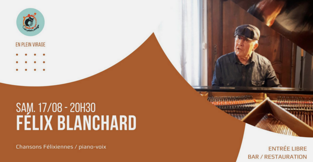 Félix Blanchard est chez lui En Plein Virage : Monsieur Loyal pour les 5 ans du bar, pianiste accompagnateur de Diane Blanchard ou Marie Crochet… Cette fois, il vient seul, et avec ses morceaux !Félix chantera donc accompagné… par lui-même au piano ! Ce dernier lui obéit aux doigts et (presque) à l’œil, enfin bon, vous savez ce que c’est…