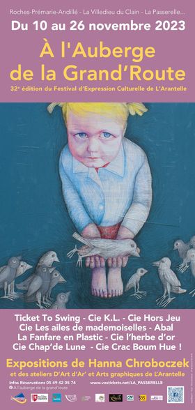 Ci-dessous le programme du 32ème festival d’expression culturelle de l’Arantelle « A L’Auberge de La Grand’Route » : c’est du 10 au 26 novembre et il y en a pour tous les goûts !!! Concerts, théâtre, expositions, pour les petits et les plus grands.