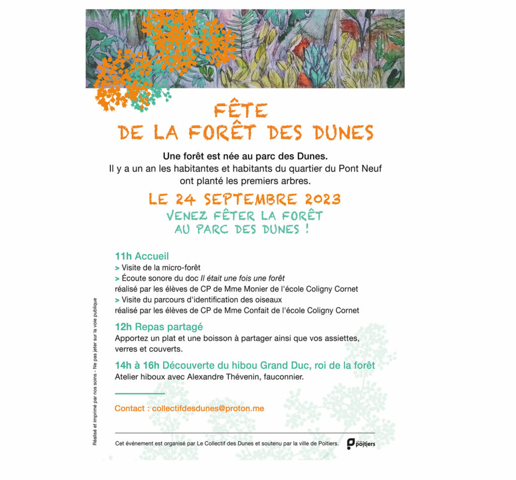 Le Collectif des Dunes est heureux de vous convier à la fête de la micro-forêt du parc des Dunes le dimanche 24 septembre à partir de 11h.