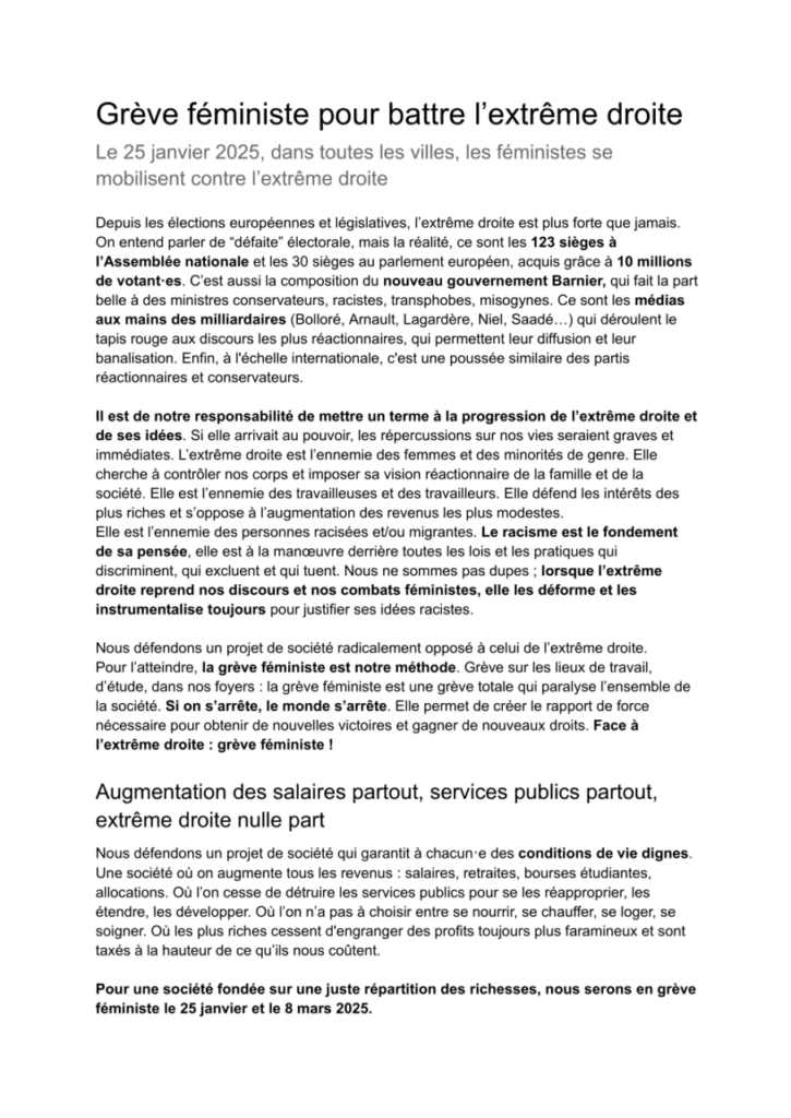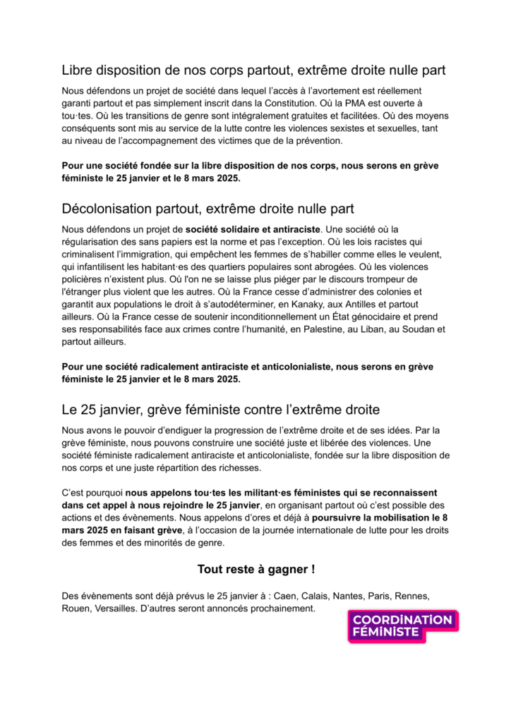 Espérant une mobilisation massive autant nationalement que localement, nous vous invitons à transmettre notre appel au sein de votre organisation et à rejoindre la mobilisation. Vous pouvez de même diffuser sur vos réseaux et en interne le tract de la Coordination Féministe joint à ce mail.