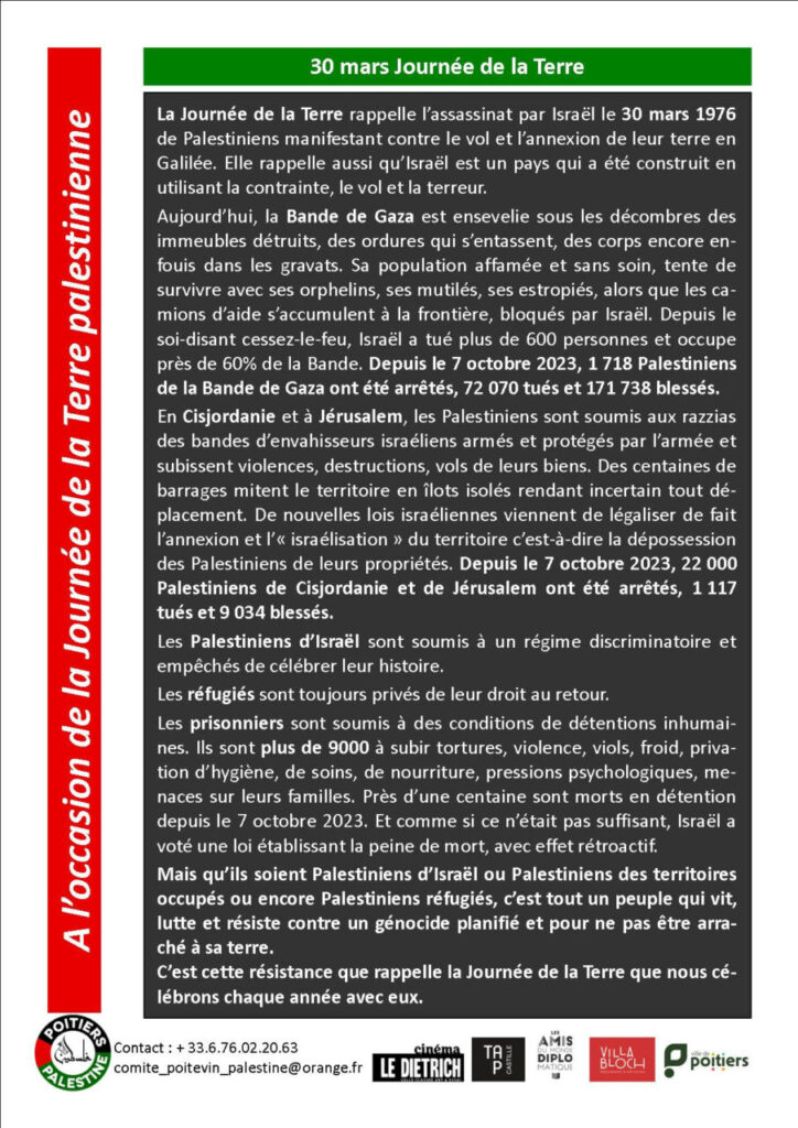 ∙ 20h30 : TAP Castille :diffusion du documentaire L’UNRWA, 75 ans d’une histoire provisoire de Lyana SALEH et Nicolas WADIMOFF. Créée en 1949 pour durer le temps de régler la question des réfugiés, l’UNRWA est tou jours là, rappelant que le droit au retour des réfugiés est toujours en vi gueur. Ce que refuse Israël qui attaque avec férocité cette agence de l’ONU et qui souhaite mettre fin à ses activités. Débat avec Fuad Hindieh, Lyana Saleh et Poitiers Palestine. Tarif unique : 6 euros