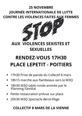 Dans la Vienne, le collectif 8 mars appelle à un rassemblement et une marche aux flambeaux, à partir de 17h30, place Lepetit en direction de la M3Q