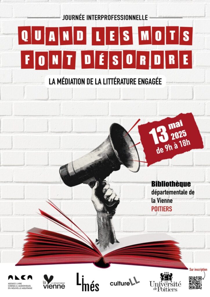 Nous avons le plaisir de vous inviter à la journée interprofessionnelle organisée à la Bibliothèque Départementale de la Vienne (2 Rue William Booth, 86000 Poitiers) par les étudiant·es de deuxième année du Master Livres et Médiations de l’Université de Poitiers. Cet événement, ouvert à tout public sur inscription, réunira des professionnel·les du livre, chercheur·euses et acteur·ices de la médiation autour des enjeux contemporains de la littérature engagée.