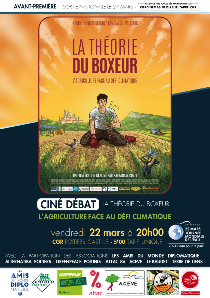 Vendredi 22 mars à 20h00 au CGR Castille de Poitiers : Ciné-débat à l’occasion de la journée mondiale de l’eau avec « La Théorie du Boxeur, l’agriculture face au défi climatique » , documentaire (1h38) de Nathanael Coste.