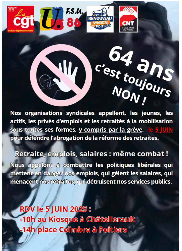 La CGT 86, la FSU 86, la CNT-SO et l’UNEF-RS appellent, les jeunes, les actifs, les privés d’emplois et les retraités à la mobilisation sous toutes ses formes, y compris par la grève, jeudi 5 Juin 2025 pour défendre l’abrogation de la réforme des retraites.