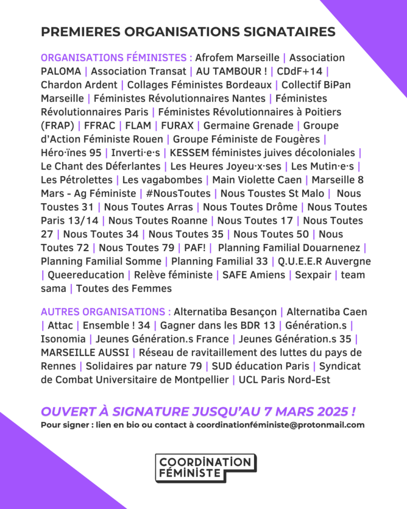 Membre de la Coordination féministe nationale, F.R.A.P. suit le mot d’ordre « grève féministe pour battre l’extrême droite » (appel complet et revendications en pièce jointe) et organise un rassemblement et une manifestation à 15h à l’hôtel de ville de Poitiers. Localement, la CNT SO 86 est signataire de l’appel et se mobilise également à cette occasion.