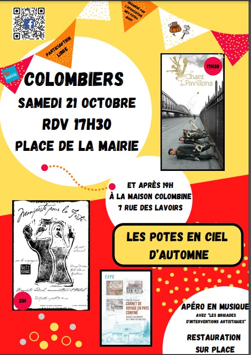 – RDV 17h30 devant la mairie pour suivre la Fausse Compagnie et « Le chant des Pavillons » jusqu’à la Maison Colombine (7 route des lavoirs ) pour la suite des festivités.