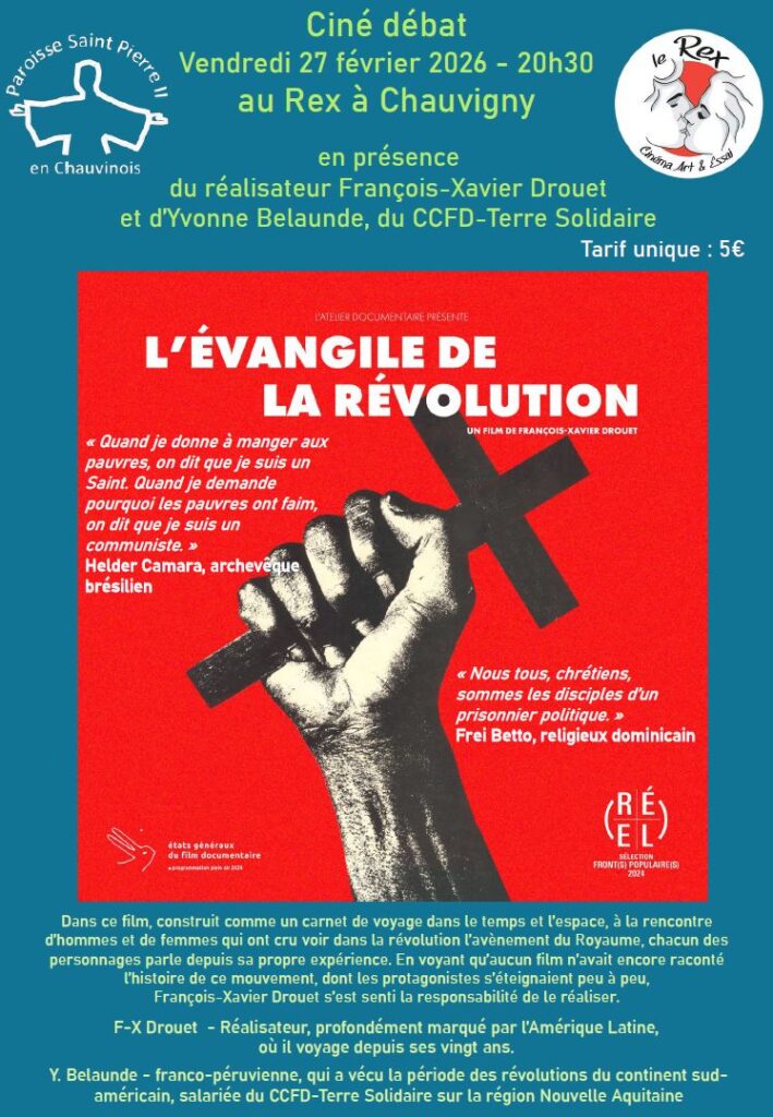 La paroisse St Pierre II et le cinéma le Rex de Chauvigny ont le plaisir de programmer le vendredi 27 février à 20h30 un ciné-débat autour du film l’Evangile de la Révolution en présence du réalisateur et d’une témoin franco-péruvienne.