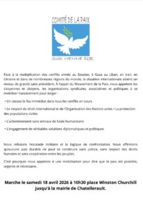 A l’ appel du mouvement de la paix une marche est organisée à Chatellerault le 18 avril pour la paix : départ à 10 h 30 de la place Winston Churchill jusque devant la mairie où il y aura quelques prises de paroles