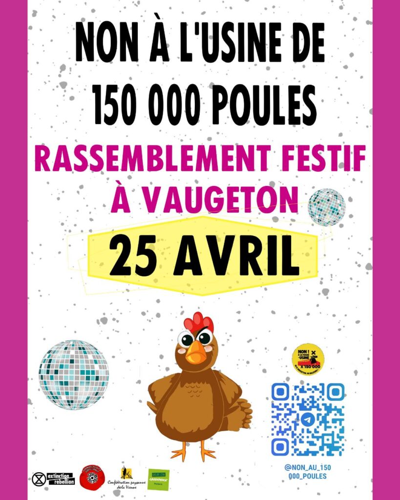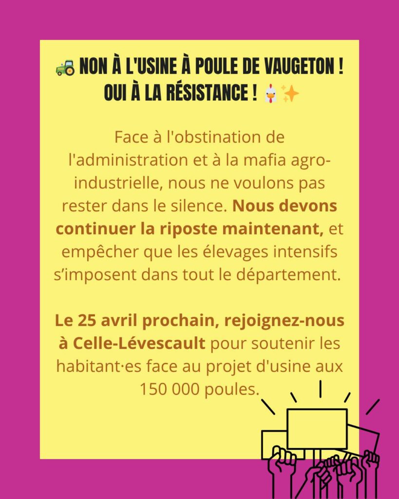 Le 25 avril prochain, rejoignez-nous à Celle-Lévescault pour soutenir les habitant·es face au projet d’usine aux 150 000 poules.