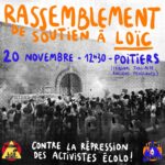 Rassemblement de soutien à Loïc ! Rendez-vous lundi 20 novembre à partir de 12h30 devant le tribunal judiciaire (ancien lycée des feuillants) de Poitiers Le 27 juillet dernier, lors du procès des inculpés de Sainte-Soline, Loïc a été condamné à un an d’emprisonnement aménagé par le port d’un bracelet électronique […]
