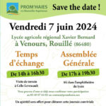 L’AG de Prom’Haies aura lieu le vendredi 7 juin 2024. Elle se tiendra au lycée agricole Xavier Bernard (Rouillé, 86480). Elle sera précédée d’une visite de ferme :“Au Jardin Gourmand”. Ce moment convivial est ouvert à tous. N’hésitez pas à venir participer. Pour en savoir plus : https://www.promhaies.net/news/vendredi-7-juin-2024-assemblee-generale-de-promhaies-a-rouille-86,19516/
