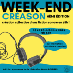 WEEK-END CRÉASON 6é édition création collective d’une fiction sonore en 48H ! à AdLib, 130 avenue de la Libération, Poitiers Le concept est de se retrouver à une quinzaine maximum pour créer le temps d’un week-end une fiction sonore pensée, tournée et montée collectivement. Une occasion de creuser dans nos […]