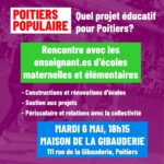L’association Poitiers populaire, qui prépare les prochaines élections municipales à Poitiers, propose une série de réunions publiques pour élaborer son projet éducatif, en matière de constructions et rénovations d’écoles, de soutien aux projets pédagogiques et éducatifs, de périscolaire et de relations entre les écoles et la collectivité plus généralement. Tous […]