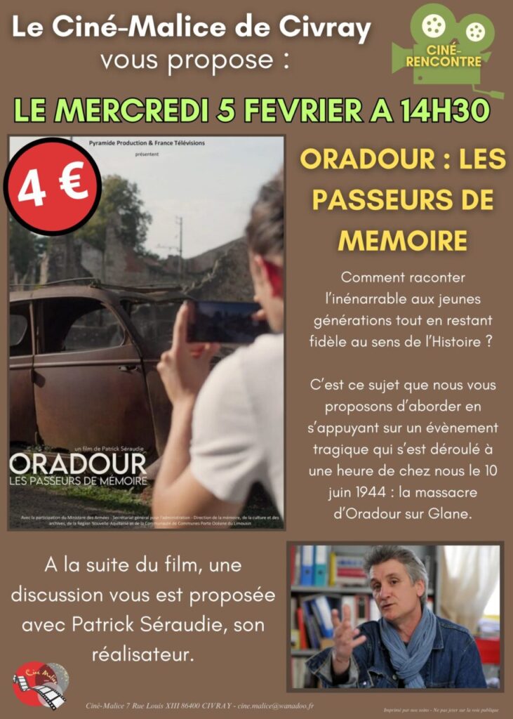 Mercredi 5 février à 14h30 : « Oradour : les passeurs de mémoire » à Ciné-Malice à Civray, projection suivie d’une discussion en présence du réalisateur Patrick Séraudie.