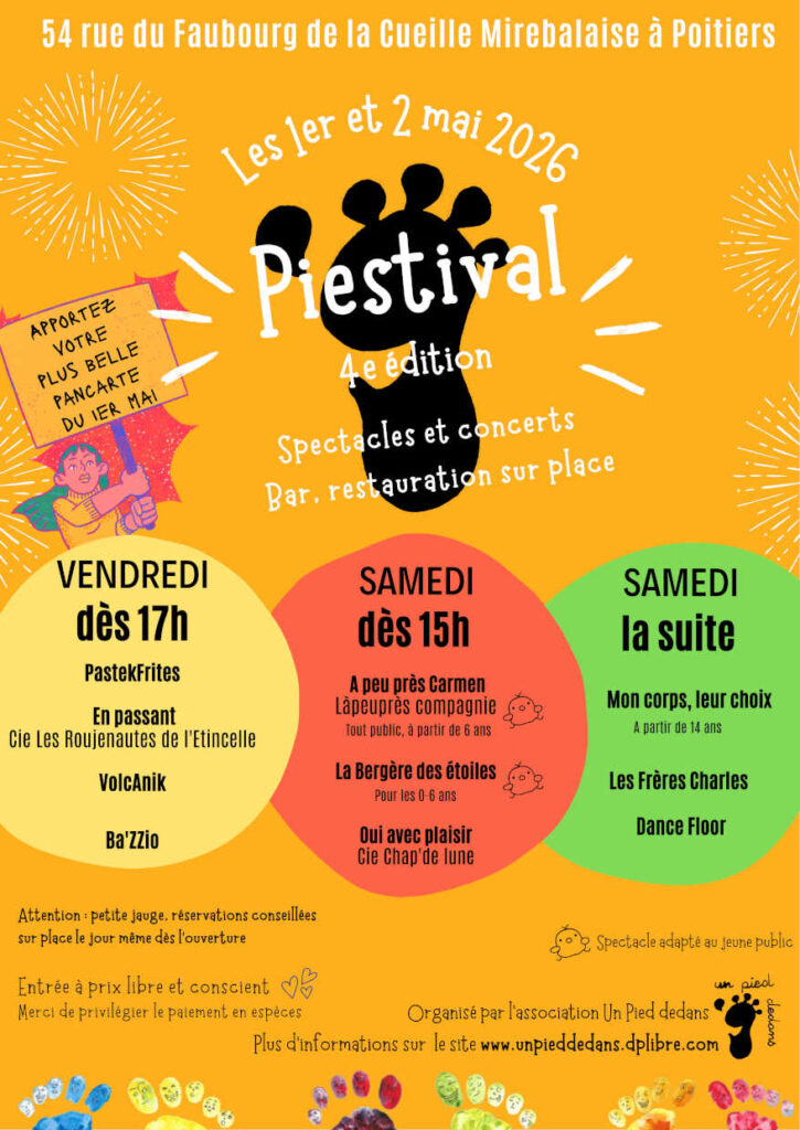 Le Piestival, festival convivial d’un Pied Dedans a lieu les 1er et 2 mai, au 54 faubourg de la Cueille Mirebalaise à Poitiers, avec de la musique, du théâtre, une conférence gesticulée, des spectacles pour enfants…