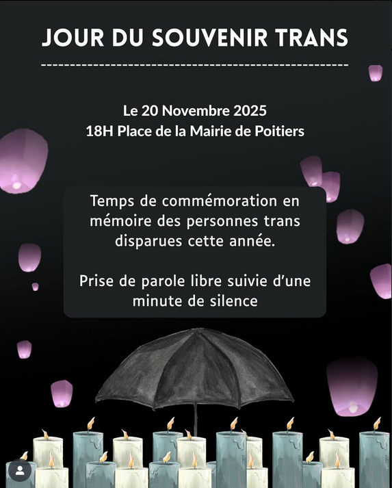 Nous nous retrouverons Jeudi 20 Novembre 2025 sur la place de la mairie à 18H pour rendre hommage aux personnes Trans disparues cette année.