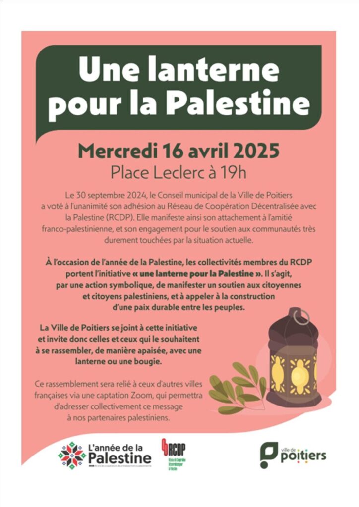 Poitiers. Ne laissez pas Gaza mourir dans le silence ! Apportez bougies, lanternes, téléphones portables ! Détails de l'événement Date: 16 avril 2025 19:00 – 20:00 Une initiative de la Maire de Poitiers dans le cadre du Réseau de coopération décentralisée avec la Palestine. Partager : Cliquez pour partager sur Facebook(ouvre dans une nouvelle fenêtre) Facebook Cliquer pour envoyer un lien par e-mail à un ami(ouvre dans une nouvelle fenêtre) E-mail Cliquez pour partager sur LinkedIn(ouvre dans une nouvelle fenêtre) LinkedIn Cliquez pour partager sur Telegram(ouvre dans une nouvelle fenêtre) Telegram Cliquez pour partager sur WhatsApp(ouvre dans une nouvelle fenêtre) WhatsApp Cliquer pour partager sur Mastodon(ouvre dans une nouvelle fenêtre) Mastodon Cliquer pour partager sur Bluesky(ouvre dans une nouvelle fenêtre) Bluesky